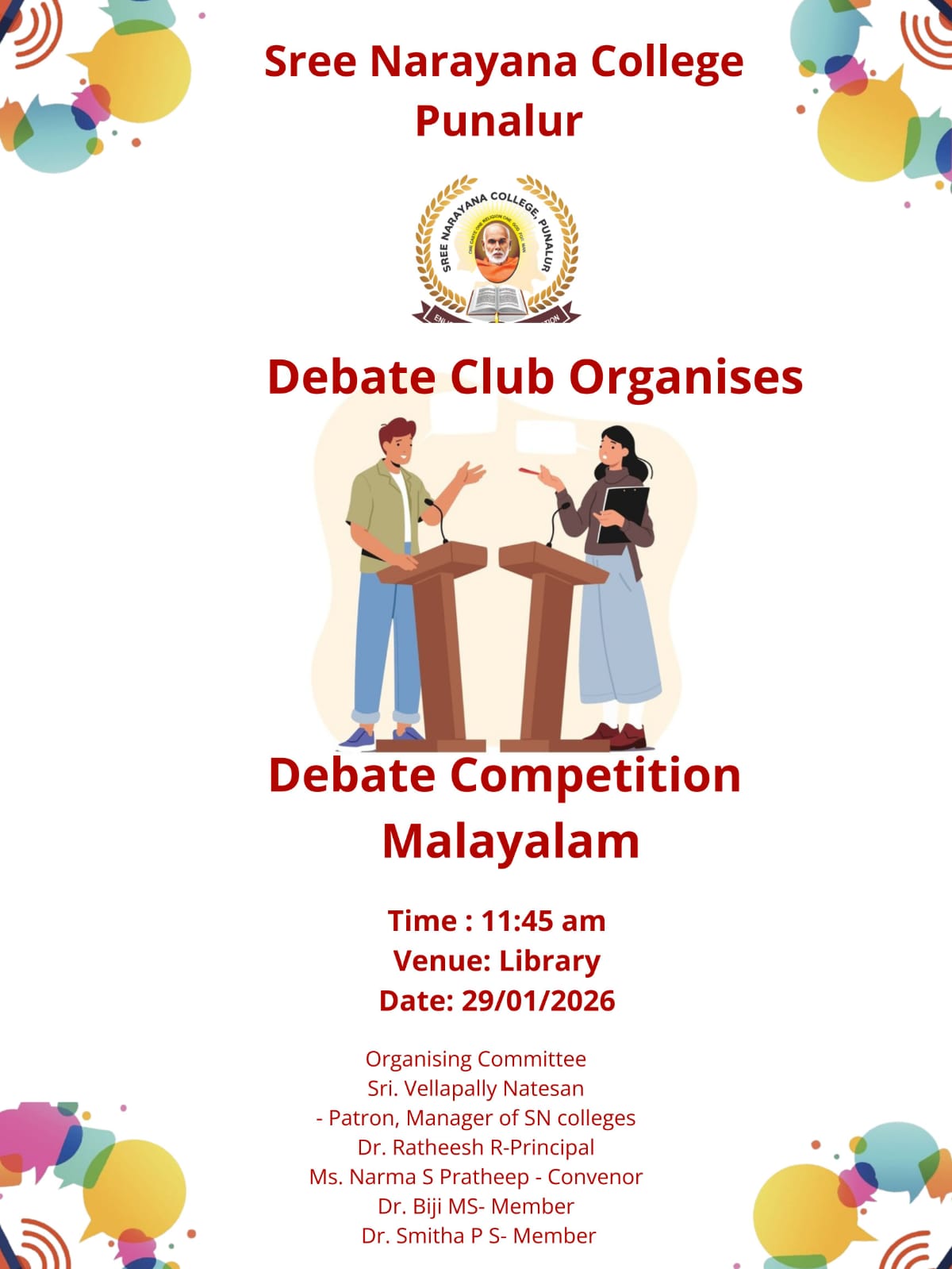 The Debate Club organised a Debate Competition on 29-01-2026 with active participation from students across departments. The event provided a platform for articulating ideas, developing reasoning skills, and encouraging healthy intellectual exchange. The competition witnessed lively arguments and thoughtful perspectives.